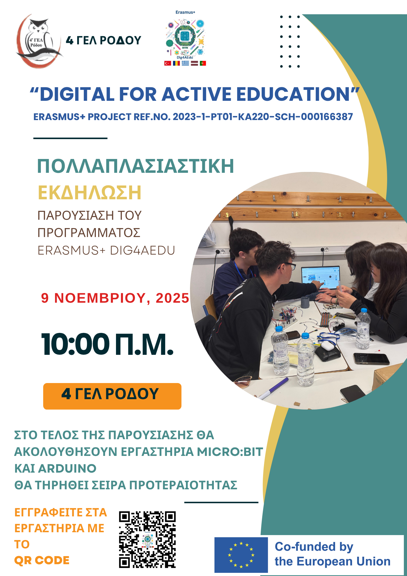 Το 4ο Γενικό Λύκειο Ρόδου προσκαλεί την εκπαιδευτική κοινότητα, τους μαθητές, τους γονείς και κάθε ενδιαφερόμενο να παρακολουθήσουν την Πολλαπλασιαστική Εκδήλωση του ευρωπαϊκού προγράμματος Erasmus+ KA220-SCH “Digital for Active Education” (Dig4AEdu), που θα πραγματοποιηθεί την Κυριακή 9 Νοεμβρίου 2025, στις 10:00 π.μ., στον χώρο του σχολείου.