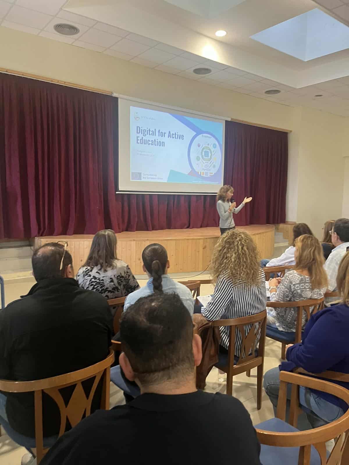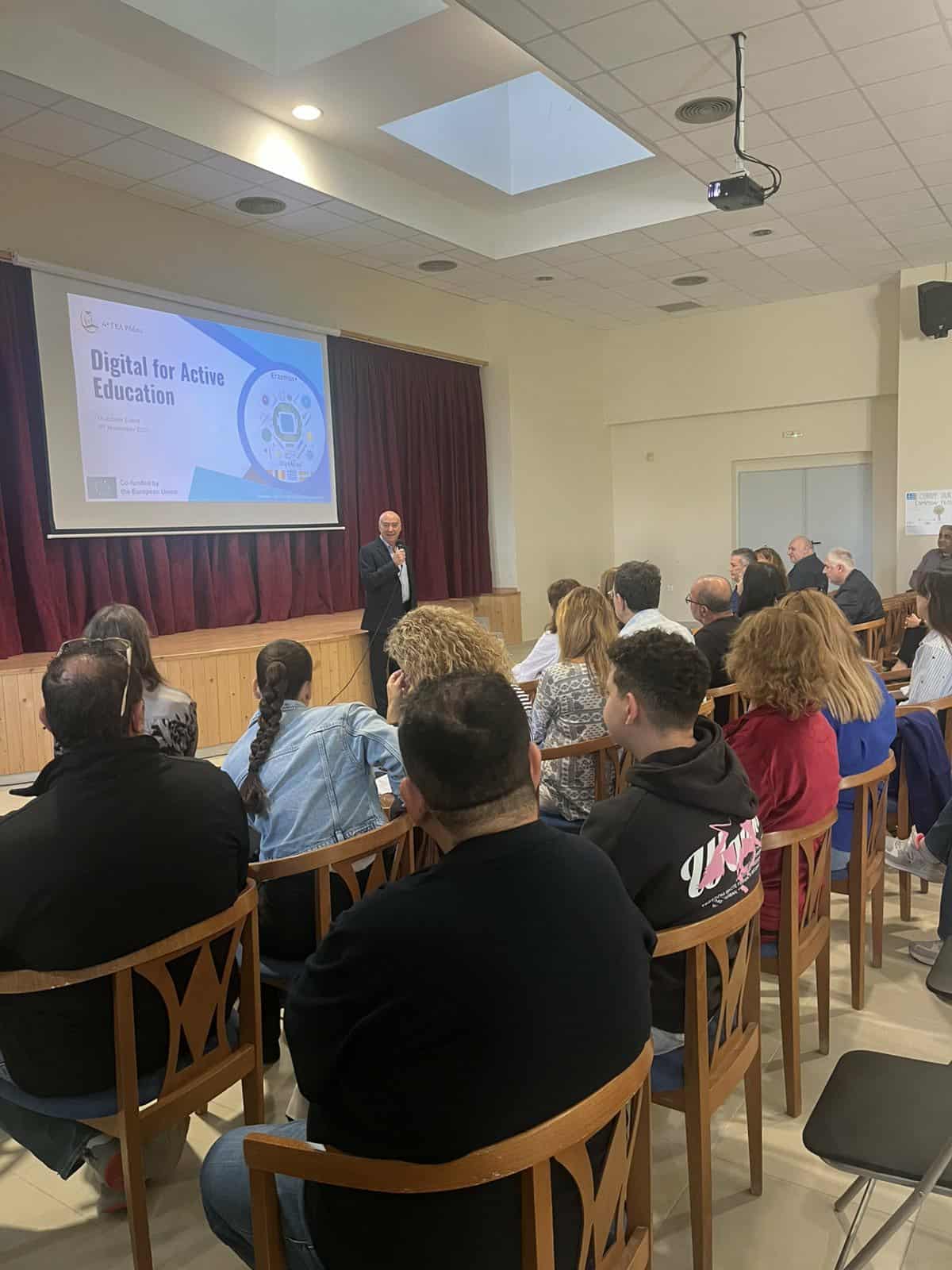 Ακολούθησε η Σχολική Σύμβουλος Παιδαγωγικής Ευθύνης, κα Ευαγγελία Μουλά, η οποία ανέδειξε τη σημασία των δύο φαινομενικά αντιθετικών όρων του τίτλου: Digital και Active. Τόνισε ότι, σε μια εποχή όπου η ψηφιακή πραγματικότητα συχνά συνδέεται με παθητικότητα και κατανάλωση περιεχομένου, το πρόγραμμα ανατρέπει αυτό το στερεότυπο και μετατρέπει την ψηφιακή τεχνολογία σε εργαλείο ενεργοποίησης της μάθησης, κριτικής σκέψης και ενεργής στάσης ζωής.