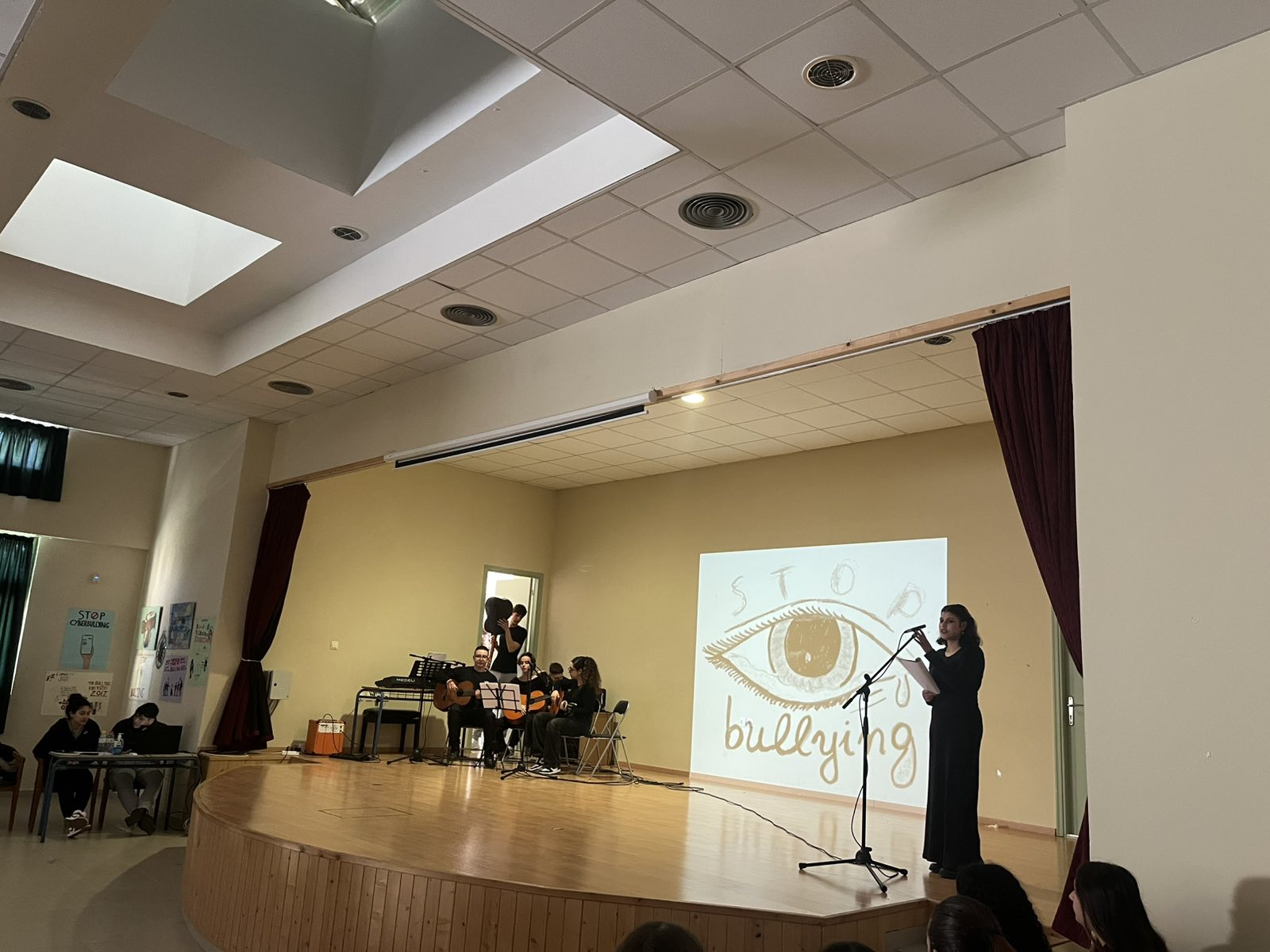 Η αίθουσα διακοσμήθηκε με ζωγραφικά έργα μαθητών του σχολείου μας με μηνύματα για την ενδοσχολική και έμφυλη βία.