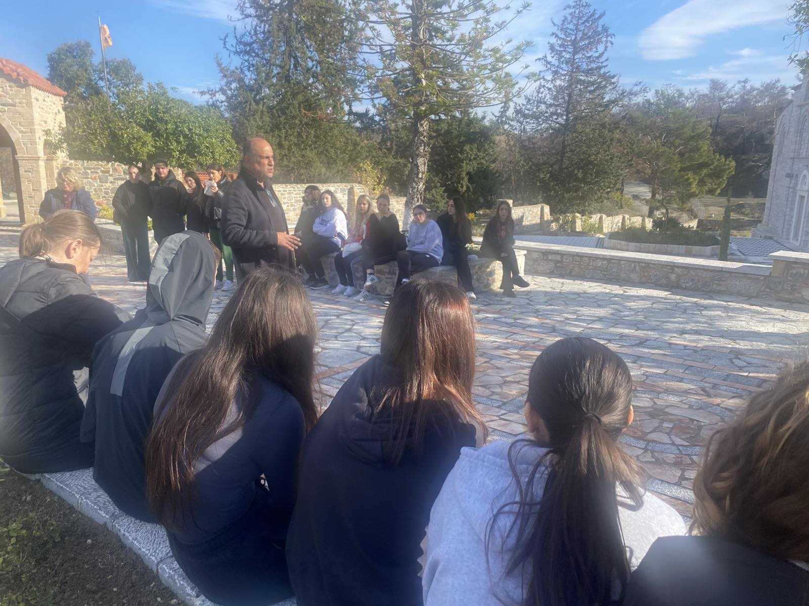 Οι μαθητές και οι μαθήτριες του σχολείου ενημερώθηκαν από την ηγουμένη για τις συνθήκες κάτω από τις οποίες διεσώθη το μοναστήρι κατά τη διάρκεια της καταστροφικής φωτιάς του καλοκαιριού του 2023.