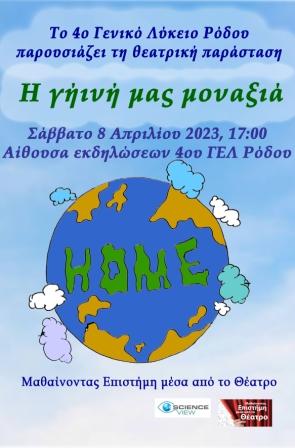 Κατά τη διάρκεια του Απριλίου οι μαθητέ/τριες της Α΄ και Β΄ Λυκείου είχαν την ευκαιρία να απολαύσουν τη θεατρική παράσταση “Η γήινη μας μοναξιά” από την Ομάδα Θεάτρου Επιστήμης του 4ου ΓΕ.Λ. Ρόδου.