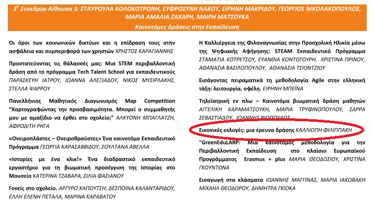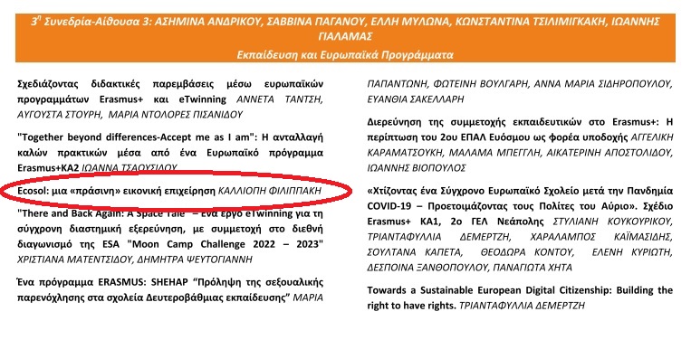 Το Σάββατο 21 Οκτωβρίου 2023 στο 9ο Διεθνές Συνέδριο για την Προώθηση της Εκπαιδευτικής Καινοτομίας στη Λάρισα, η εκπαιδευτικός – οικονομολόγος του 4ου ΓΕ.Λ. Ρόδου, Λίνα Φιλππάκη παρουσίασε την έρευνα με θέμα: " Εικόνες εκλογές: μια έρευνα δράσης " και μια δεύτερη εισήγηση με θέμα: άρθρο της με θέμα: " Ecosol: μια "πράσινη" εικονική επιχείρηση ".